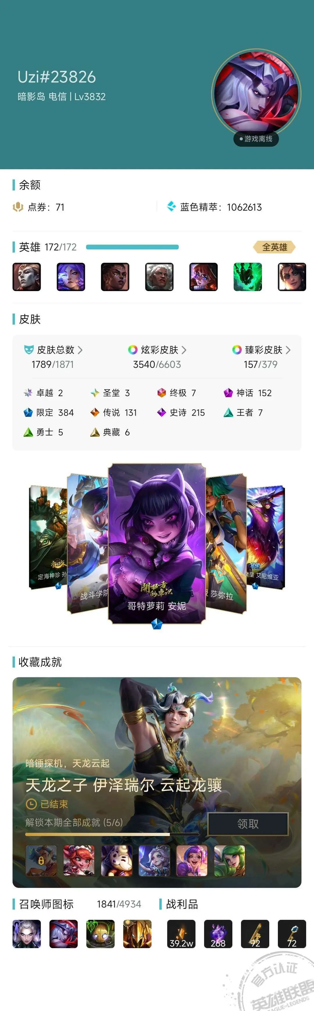 租前请看:原皮1789,炫彩3520,全至臻神话系列皮肤。云顶至臻龙的传人小小李青,神话级灵魂莲华阿狸、斗魂格温、神龙烈焰金克斯、神龙亚索、青花瓷拉克丝、神龙尊者李青、福星安妮小小英雄,神话级KDA、虎啸龙呤、群星依旧在、胖胖龙度假村棋盘等海量小小英雄与棋盘!