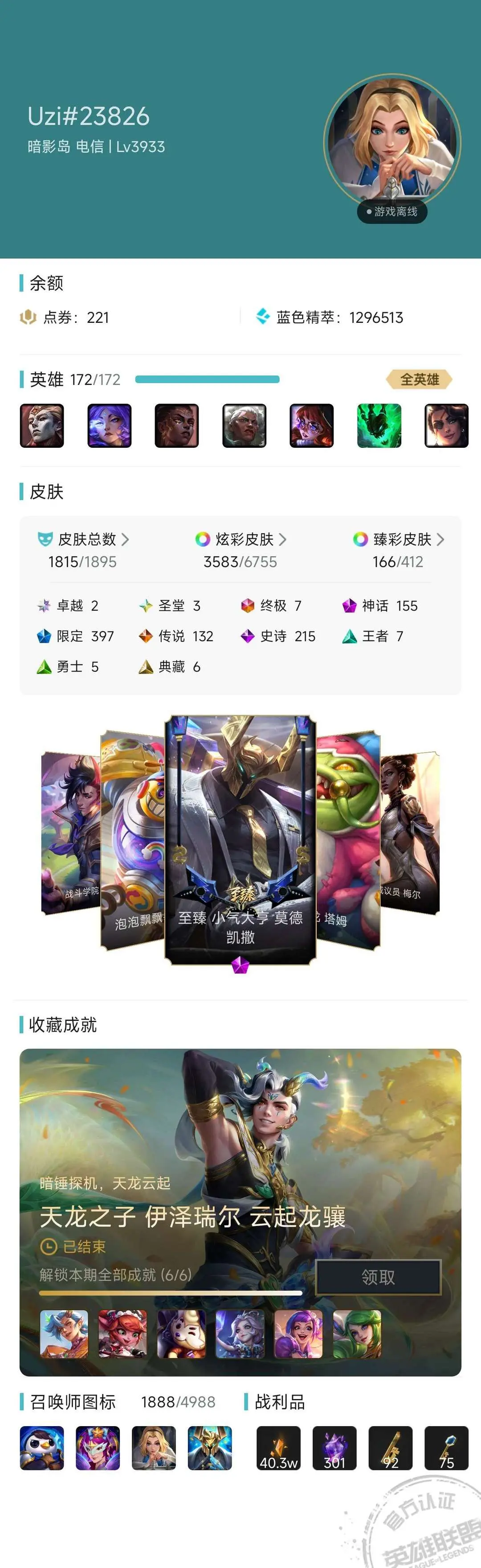 租前请看:原皮1815,炫彩3686,全至臻神话系列皮肤。云顶至臻龙的传人小小李青,神话级灵魂莲华阿狸、斗魂格温、神龙烈焰金克斯、神龙亚索、青花瓷拉克丝、神龙尊者李青、福星安妮小小英雄,神话级KDA、虎啸龙呤、群星依旧在、胖胖龙度假村棋盘等海量小小英雄与棋盘!